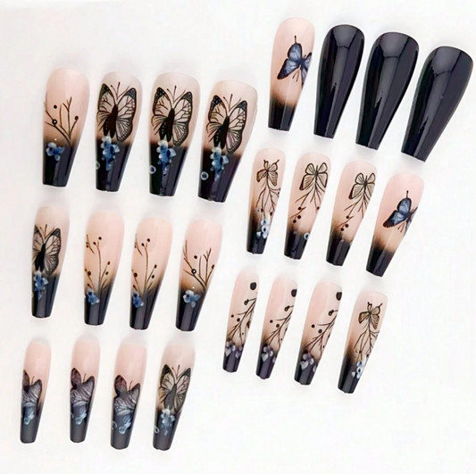 24 Pièces Ongles à Presser – Noir Brillant avec Motif Papillon, Élégance Instantanée