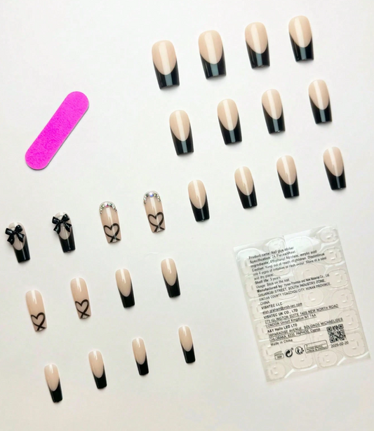 24 Ongles Press-On Y2K – Design Élégant avec Nœud Noir et Strass, Kit Complet
